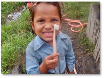 紙芝居を見終わった後は、実際に歯ブラシを使って歯磨きを体験。歯を磨いたことがない子どもたちは、自分の歯ブラシを手にし、目はきらきらと輝き大喜びしていました。中には、歯ブラシをかんざしのように使ってヘアアクセサリーにする子どもも。彼らの純粋な喜びに触れ、私たちも心が温かくなりました。