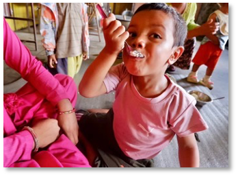 ラムチェ村では稲作が行われており、給食にはご飯やミルク粥が提供されることがありますが、炭水化物中心のメニューでは栄養が偏りがちです。