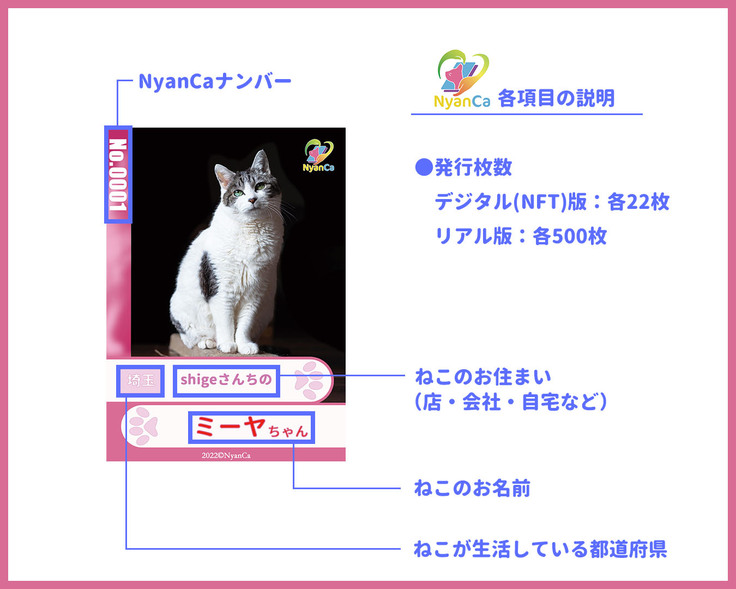 日本全国から募集した猫の写真をデジタルトレーディングカード化し、オンラインで販売。そちらの収益を元にリアルトレーディングカードを製作し、全国の保護猫カフェ・店舗・イベントで無料配布するというプロジェクトです。
