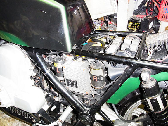 左サイドカバーの下にあるのは、点火系装置と点火コイルで、