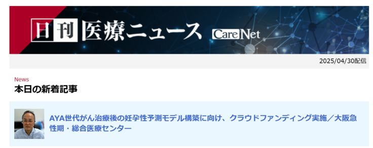 本日、CareNet.comに「AYA世代がん治療後の妊孕性予測モデル構築に向け、クラウドファンディング実施」の記事が配信されました。掲載記事からクラウドファンディングのページに入っていただくことができます。