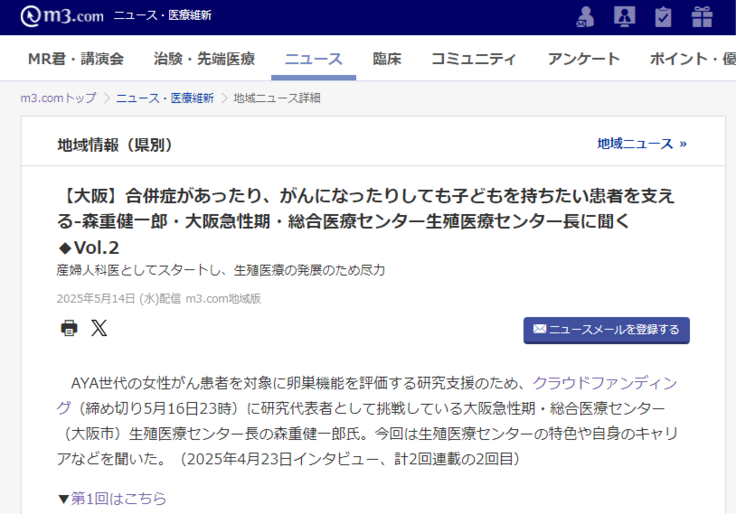 本日、m3.com 地域版 に、5月7日に配信された1回目に続き「【大阪】合併症があったり、がんになったりしても子どもを持ちたい患者を支える-森重健一郎・大阪急性期・総合医療センター生殖医療センター長に聞く◆Vol.2」の記事が配信されました。