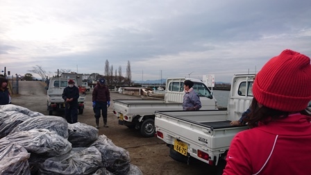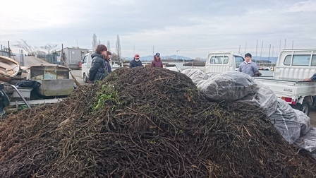 オオバナミズキンバイは、すでに漁協さんが、短くカットしてくださっていました。山に積まれた水草を前に、琵琶湖からの冷たい風が身に染みて震えが止まりませんでした。