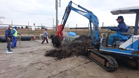 この日のために、効率的に作業を行うためのアイテムを持ってきてくださる方、パワーショベルから直接袋で受け取る方など、様々なアイデアを駆使したおかげで、予定時間より大変早い、およそ1時間ほどで作業を終えることができました。