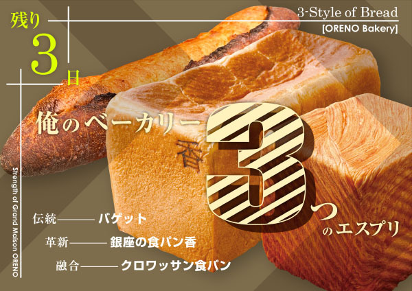 本日は、「Grand Maison ORENO」に併設されている「俺のBakery」の3つのパンに因んだ画像とともにお届けいたします。