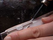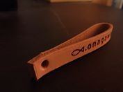 革の毛羽を抑えるクリームを塗り、ロゴを焼印。 ボンドで接着してリングを通す穴をあけます。