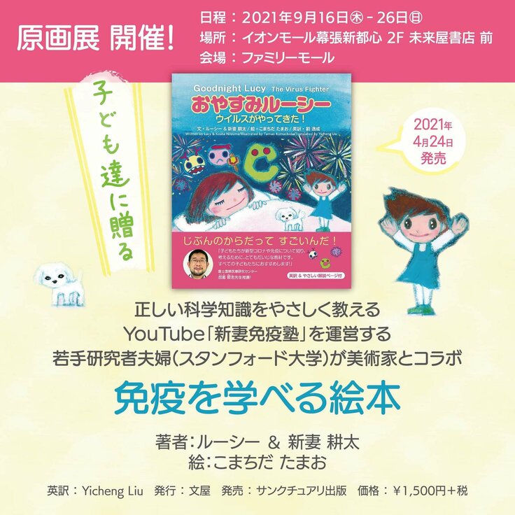 9月16日から26日に、免疫を学べる絵本「おやすみルーシー」の原画展がイオンモール幕張新都心2階の未来屋書店前で行われています。