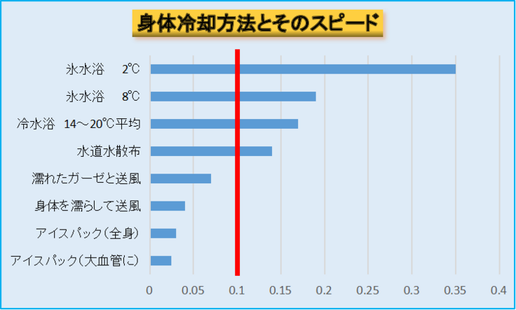 下のグラフは熱中症になった時の身体冷却方法の違いによる冷却速度をグラフ化した物です。