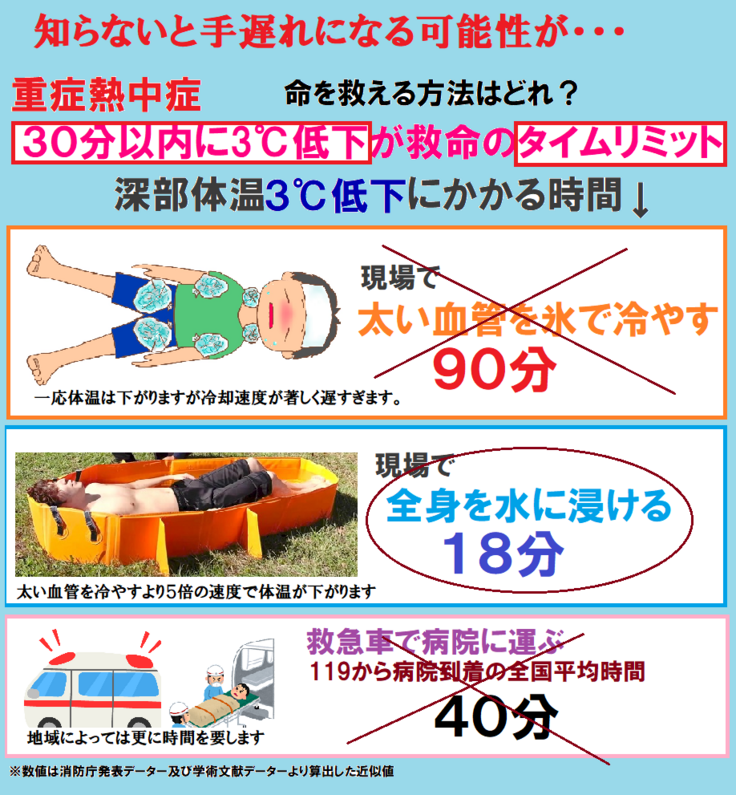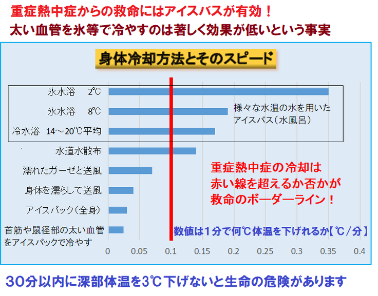 唯一アイスバスで全身を水に浸けて冷却する方法が救命のタイムリミットをクリアしています。