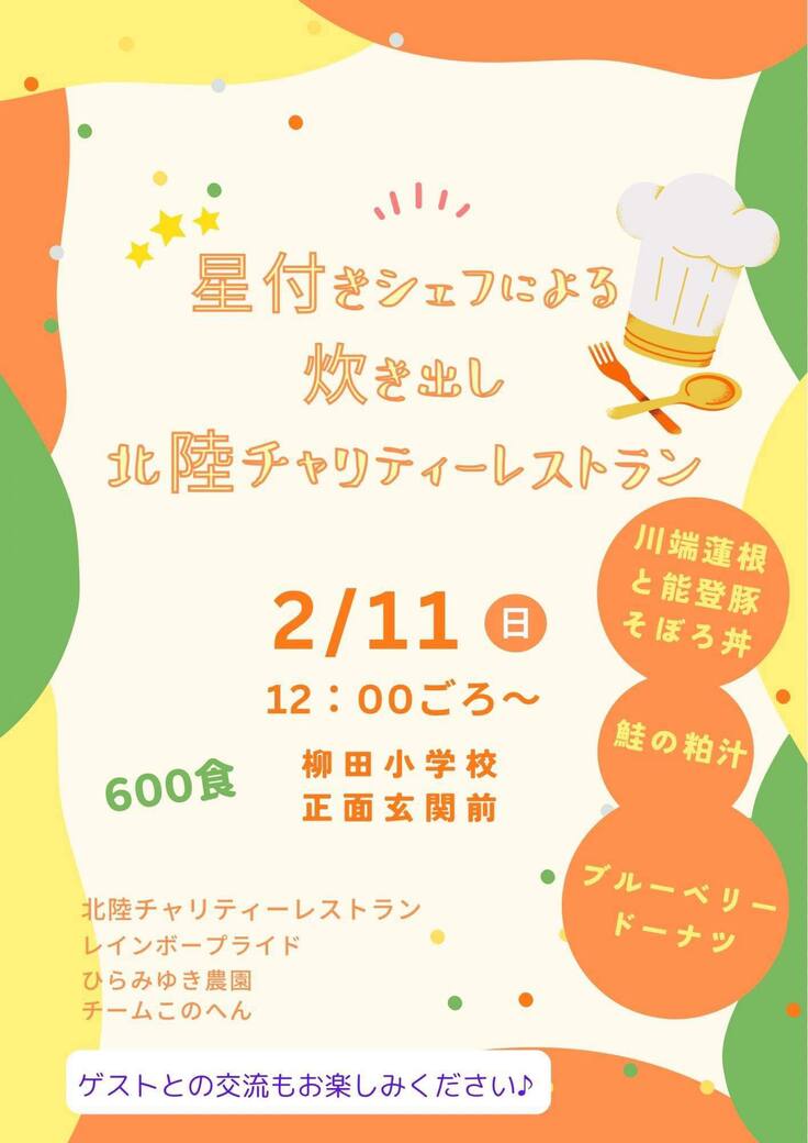 2月11日に能登町立柳田小学校にて実施された、ミシュラン星付きシェフによる炊き出し「北陸チャリティーレストラン」へ資金提供を行い、600食の食事を提供しました。