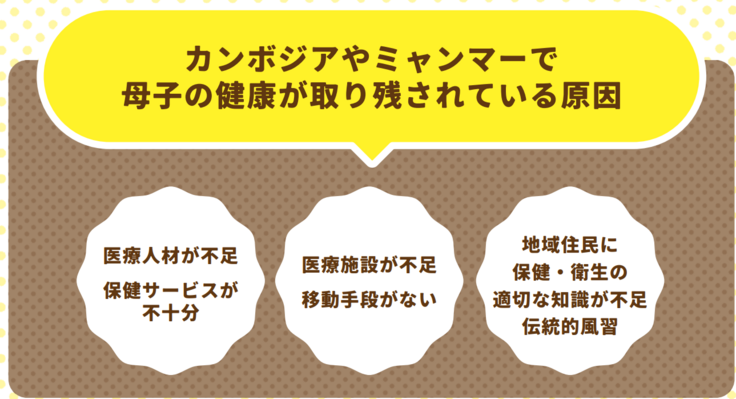 カンボジアやミャンマーでは、医療施設や医療人材の不足、人々の保健衛生に関する知識不足などにより、お母さんが出産前後に亡くなるリスクや赤ちゃんが1歳までに亡くなるリスクが未だにとても高い状況です。