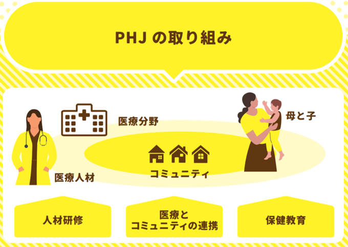 PHJが目指しているのは、誰もが健やかに暮らせる地域づくり。特に母と子の健康のための保健サービスの充実に向けた支援が必要です。