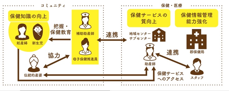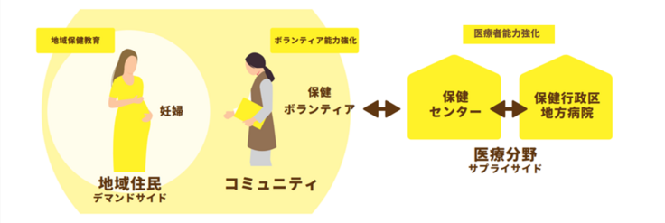 具体的には①地方病院と保健センターの助産サービスが向上し、連携が強化される②ボランティアの能力が強化され、保健センターとコミュニティの連携が強化される③地域住民の母子保健、特に安全な妊娠・出産に関する知識が向上する ための取り組みを行います。