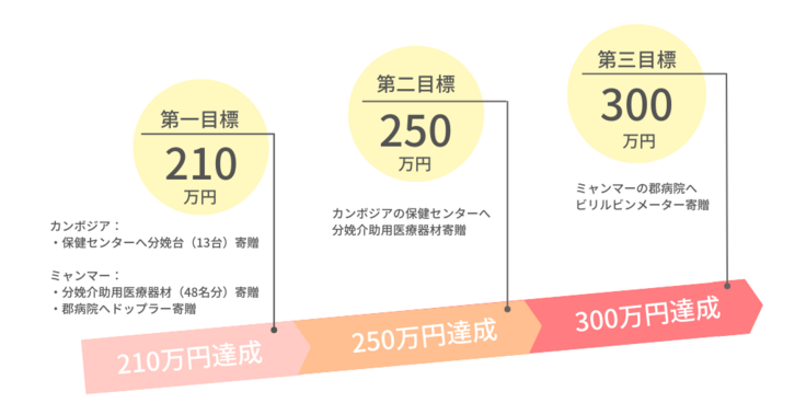 温かい応援と励ましのお言葉をこれからの活動のエネルギーとして、次の目標を300万円と設定させていただきます。今後いただいたご支援で、ミャンマーの郡病院へのビリルビンメーターの寄贈を予定しています。