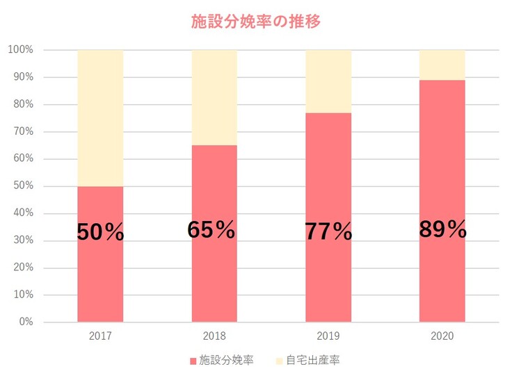 事業開始時(2017)は施設分娩率と自宅出産率が半々でしたが、事業実施後(2020年)は施設分娩率が89%に上昇しました。