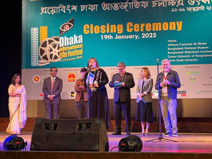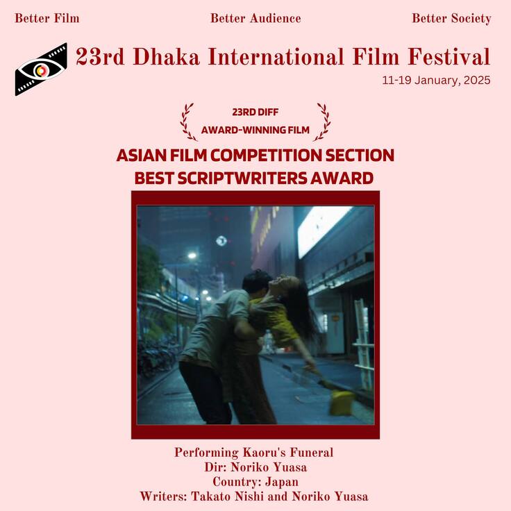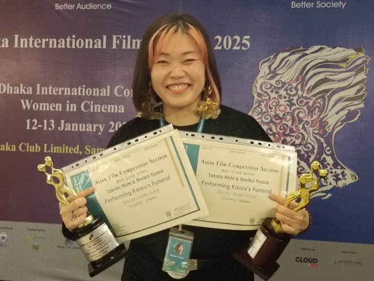バングラデシュ・ダッカ国際映画祭では、220を超える上映作、70か国以上もの国々から作品がえらばれました。中でもアジアンフィルムセクションは、の最上位部門で、唯一のコンペティションとなり、世界中の選りすぐりの作品17本の中から、本作『カオルの葬式』が最優秀脚本賞を受賞となりました。