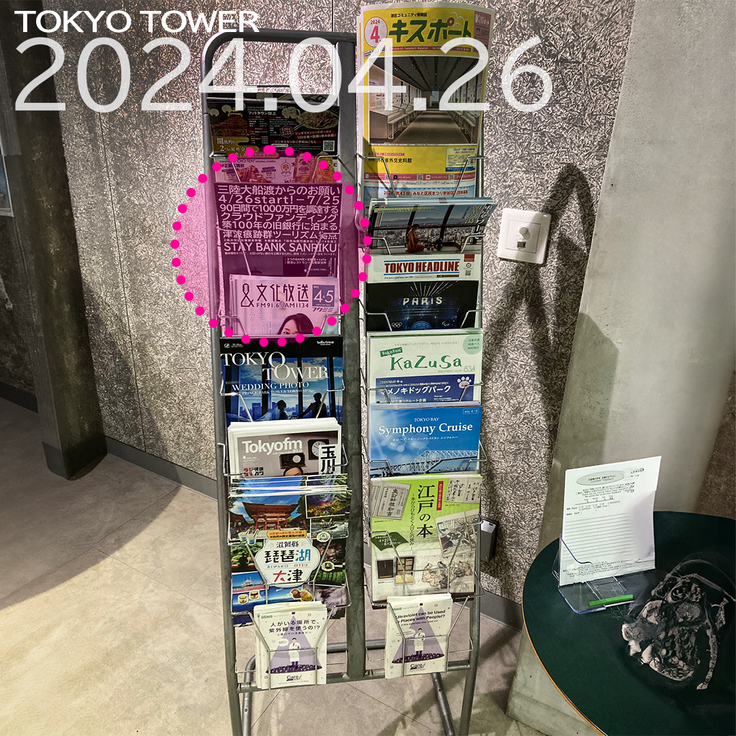東京タワーは、国内外の観光客が東京タワーを背景に記念撮影する様があちこちで見られました。岩手沿岸の小さな古い銀行の企画のために、貴重なラックの枠をご提供頂きました東京タワー様、ありがとうございました。