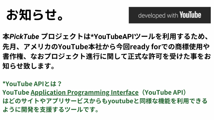 ●'YouTubeAPI'を利用した「PickTube」プロジェクトを企画したきっかけについては一番下段のプロフィールをご参照ください。