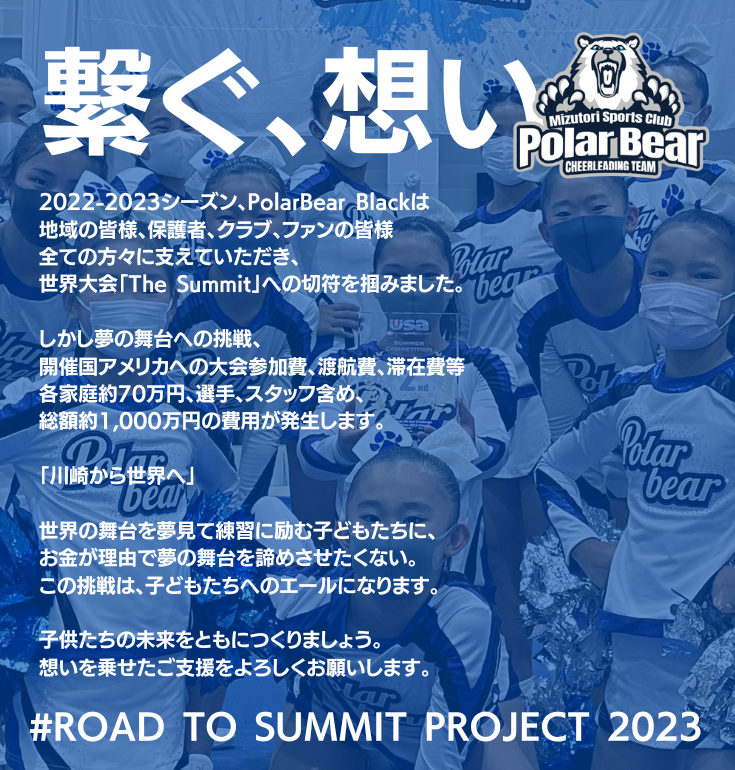 チアリーディングという競技がより、見てくれる人の背中を押すため、チアリーディングの可能性をより広げるため、この活動を通して、日本のチアリーディングの現状、輝かしい舞台の上の笑顔に隠れた、幼き選手たち、各家庭の苦労や負担を心の片隅にだけでも、置いていただき、日本のチアリーディングの発展のため、この挑戦は、PolarBearのみならず、チアリーディングに取り組む、日本の子どもたちへのエールになります。