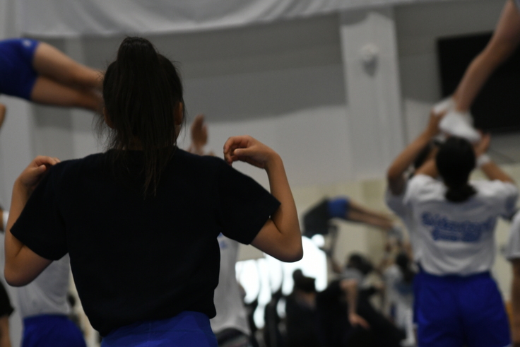 今まで取り組んだことのない、レベルの高い技々に挑戦を続け、体操選手の様なアクロバットもチームが立ち上がった当初は、メンバー14人のうち半数もできる技ではありませんでした。ハードな演技をやり抜くための地味な基礎練習、ハードな筋力トレーニングやチアリーディングにかかせない柔軟運動などを、日々反復して行い、数々の恐怖や葛藤を乗り越えて今に至ります。