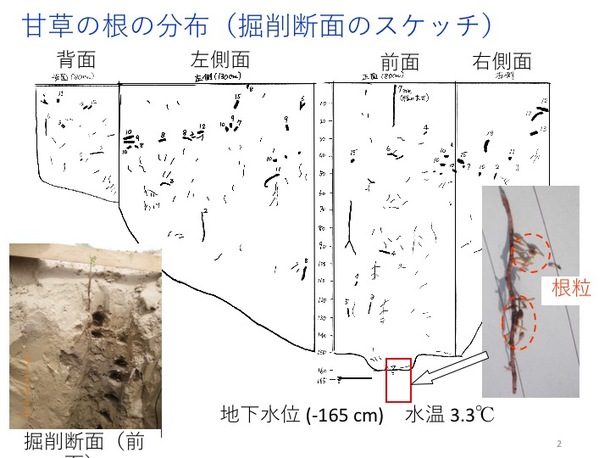 160cmほど掘ると,地下水が見られ,根が地下水位以下まで伸びていることがわかりました(水温3.3度)。