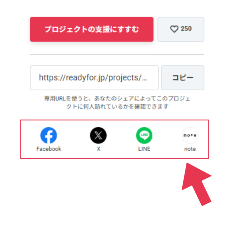 READYFORのプロジェクトページにあるFacebook、X(旧Twitter)、LINE、noteのアイコンから、ハッシュタグ「#保護猫カフェQsmet」を付けてシェアしていただけませんか?