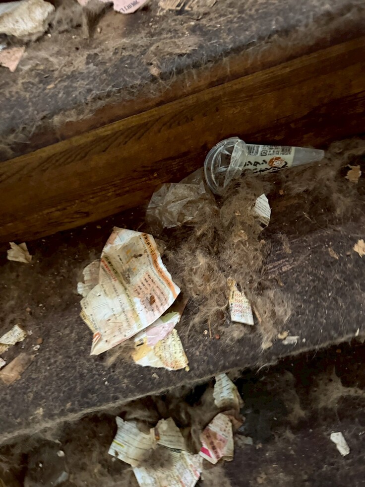 階段は、糞尿と抜け毛、ゴミで埋め尽くされかなり足場が悪く掃除をするのも難易度が高い場所