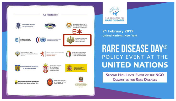 RDDは、希少・難治性疾患領域の啓発イベントとして、世界中で着実に広がってきています。2019年2月には、日本を含む13カ国が共同ホストとなり、アメリカ合衆国ニューヨークにある国際連合ビルにてRDDが行われ、希少・難治性疾患領域の国際政策について議論が行われました。