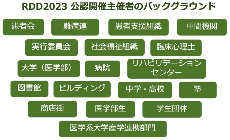 そこからどんどん当事者に関連した組織以外の主催者も参入し、多様なバックグラウンドをもつ主催者のかたがたが、希少・難治性疾患の患者さんとご家族の生活の質(QOL)の向上のために、自分たちのできるRDDイベントを実施しています。