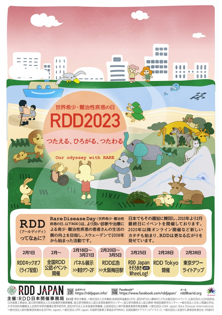 Rare Disease Day (世界希少・難治性疾患の日、以下RDD)はより良い診断や治療による希少・難治性疾患の患者さんの生活の質の向上を目指して、スウェーデンで2008年から始まった活動です。日本でもRDDの趣旨に賛同し、2010年から2月最終日に全国各地でイベントを開催しております。私達は、RDDが患者さんと社会をつなぐ架け橋となり、希少・難治性疾患の認知度向上のきっかけとなることを期待しております。