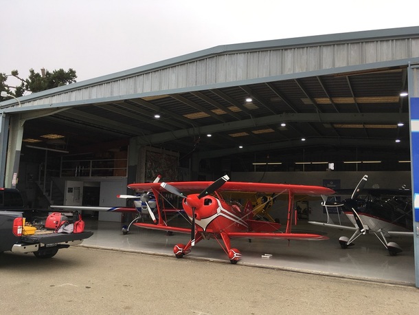 レッドランズ空港で「WESTWIND FLYING CLUB」を経営する、西村さんご夫妻のお世話になります。格納庫に到着し、一休み。