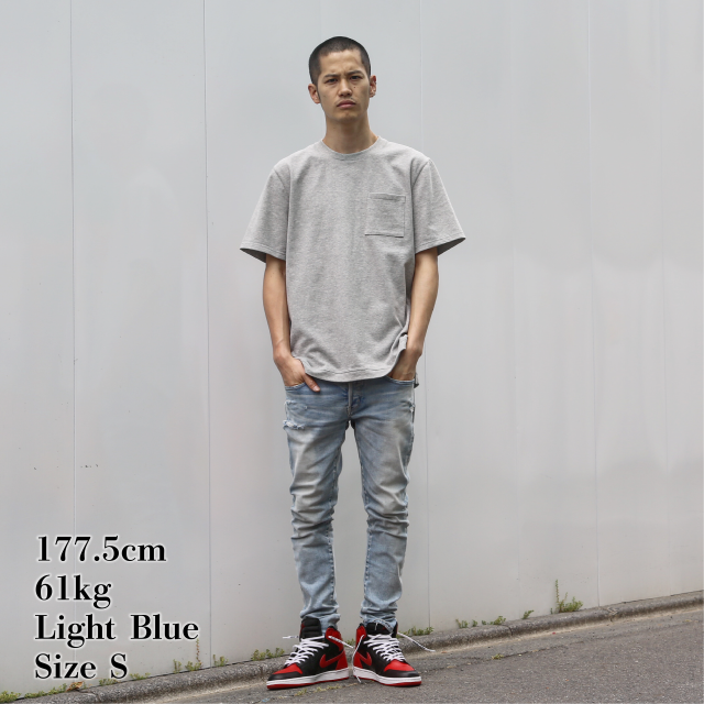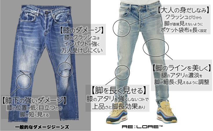 脚が長く、好印象に見えるようにダメージ加工の位置、サイズ、加工の濃淡、強さなどすべて細かく計算しております!