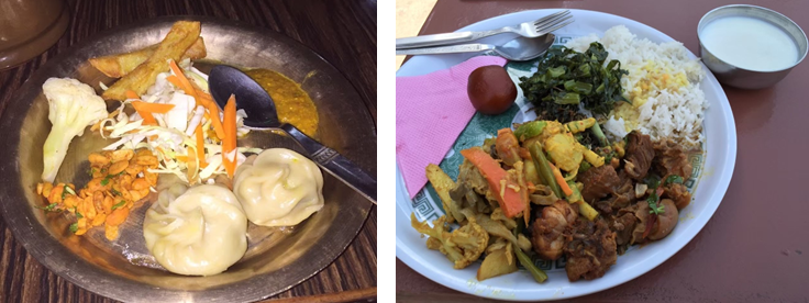 豆のスープは、別の入れ物に入っていたり、一緒に盛りつけられることもありますが、どちらも食べる時には日本でカレーライスを食べる時のように、ごはんと混ぜて食べます。ネパールの人たちは上手に右手で食べます。野菜のおかずは、じゃがいも、カリフラワーなどのスパイス炒めが多く、それにほうれん草などの青菜の炒めもの、チキンなどの肉がつく場合もあります。牛は神様の乗り物なので、牛肉は食べませんが、水牛は食べるようです。同じ牛なのでは?と思いますが、ネパールでは厳格に分けられているようです。