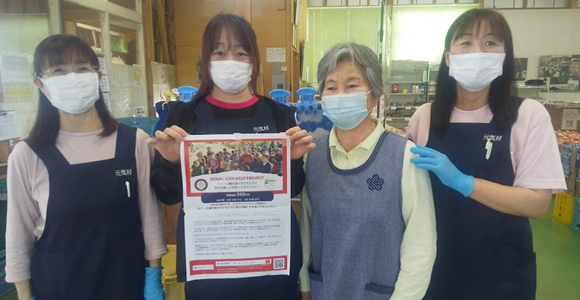 いきなり、茨城県なのですが、常総市で新鮮採れたて野菜や卵を販売している産地直送のお店です。実は、この「元気村」には日本や世界各地の災害時に活躍されている民間ボランティアの方々が集まってくるところなのです。時には、困っている人のところへ助けに行き、先日はウクライナの歌手の方にお祭りに参加してもらうなど、自助・共助の精神で頑張っています。今回は、このプロジェクトのポスターやチラシとともに、店舗のみなさんで応援もしてくださっています!