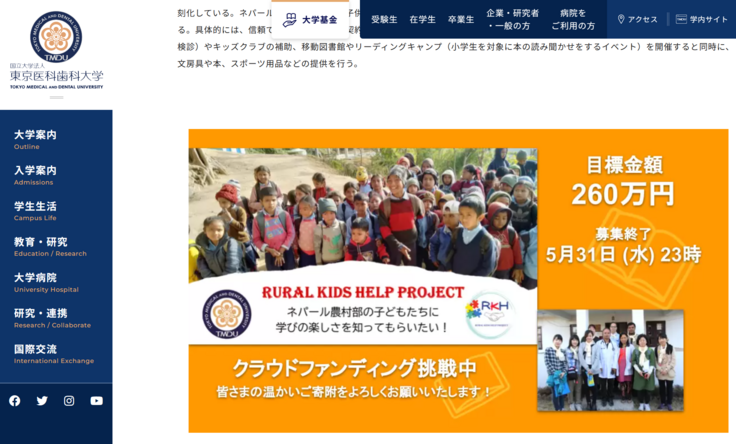 ご紹介が遅くなってしまいましたが、こちらのクラウドファンディングは東京医科歯科大学のホームページでも紹介されています。