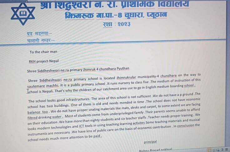 今回は支援対象の小学校紹介③Shree Shidhyashory primary schoolをお届けいたします。以下の写真と文章が校長先生からのお手紙です。日本語訳も載せています。