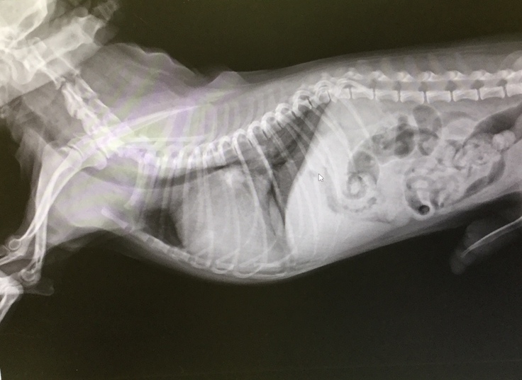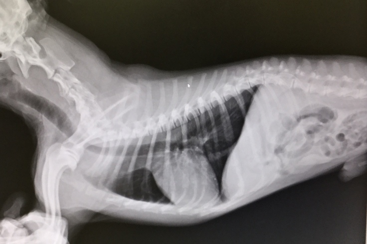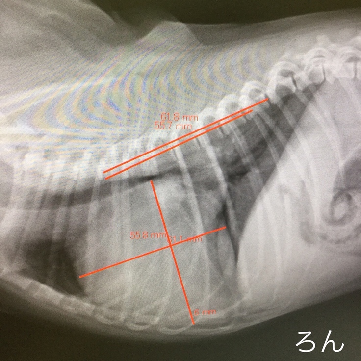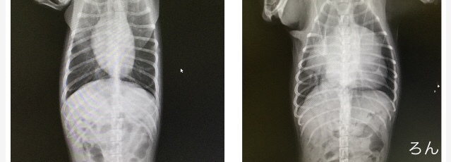 こちらは9月11日の心臓検査の診察結果です。写真を比較していただくと、心臓が大きく肥大しており気管を圧迫しているのが分かります。