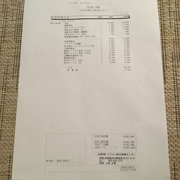 12月にJASMINEどうぶつ総合医療センターにて手術を予定しています。通常、初診が受けられるのは本来であれば12月でしたが、ろんの体がそれまで持つか分からない状態で緊急性が高いことから、急遽、緊急枠に入れていただき、9月下旬に検査を受け12月に手術予定となりました。