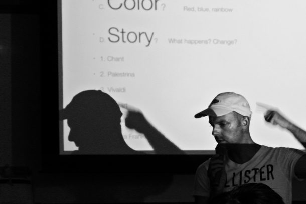 ジェフは、あらゆるジャンル(グレゴリアンに始まり、バッハ、ビリーホリデー、ラテン音楽、アンダーグラウンドなものから今アメリカで流行っているポップまで)のサウンドを教材にします。時には教室がクラブの様な騒ぎになっている事もありますし、かと思えばみんなシーンとして静かな音に聞き入っている事もあります。そして最終的にはそれらが、きちんとした音楽史であったり、専門的には編曲に至るまでの学問となっているのです。