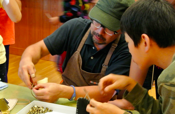 NGKの参加は今年で4年目となり、「じん先生」としては、子ども・保護者共に大人気のレザークラフトでお馴染み。現場と事務局をかけもち、ロジスティクス全般も管理する中核メンバーです。