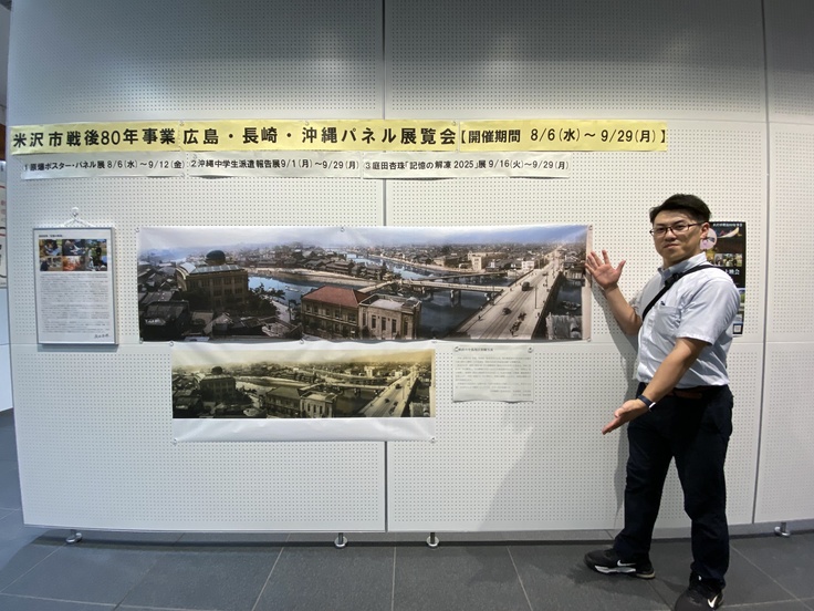 最後に…6月に各学校で展示した時もお手伝いただき、すっかり展示マスターになった総務課の青木さん。米沢市役所では、9月15日〜29日までの間、カラー化写真24点を展示しました。