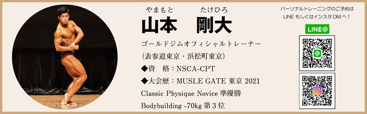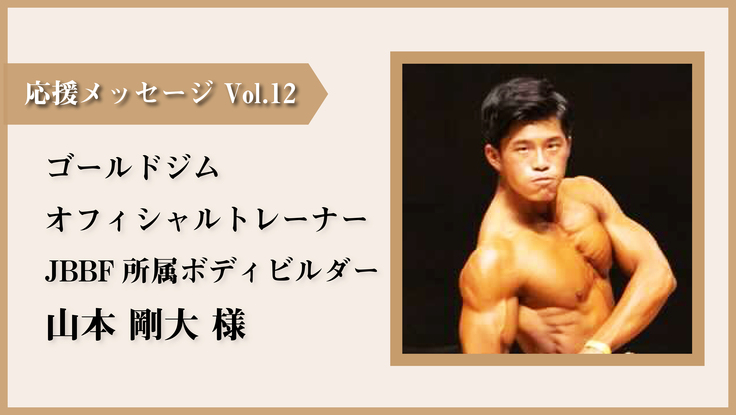 今回は、ゴールドジムオフィシャルトレーナーとしてトレーニング初心者からアスリートを含む上級者まで、幅広い層へパーソナルトレーニング指導を行いながら、自身もJBBF所属のボディビルダーとして、数々の大会で入賞をされている山本剛大様に応援メッセージをいただきました。