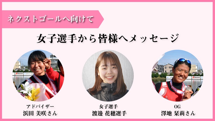 本日は、ネクストゴール「女子艇の購入」へ向け、現役部員の渡邊花穂選手からの皆様へ向けたメッセージ並びに、OGのお二人から応援メッセージをいただきました!