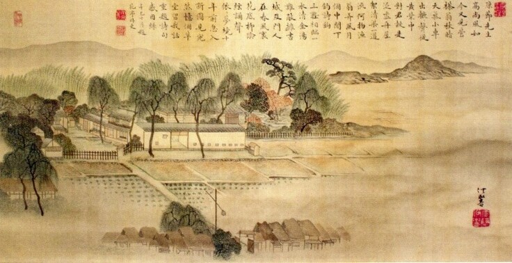 茶山の時代、神辺は遊民が増加し、「ことの外悪風俗の処」でした。茶山は学問や教育の力によって当時の身分制的な社会秩序を回復し、維持していくことを目指し、自宅近くに私塾を開設しました。後に、茶山は、この塾の永続を願い、塾の建物、塾付属の田畑を福山藩に献上して福山藩の郷校としました。塾主の茶山を中心に、都講として藤井暮庵、頼山陽、北条霞亭たちがいました。