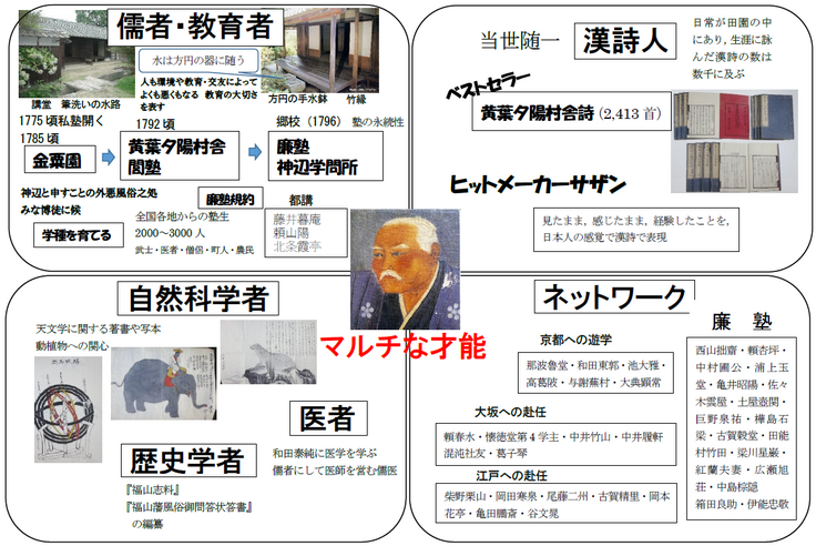 教育者として郷里の備後神辺に開いた私塾は、福山藩の郷校として認められ、「神辺学問所」として多くの子弟を育成しました。また医者であり、自然科学者、歴史学者でもあった茶山は、まさに,マルチな才能を持つスーパースターでした。