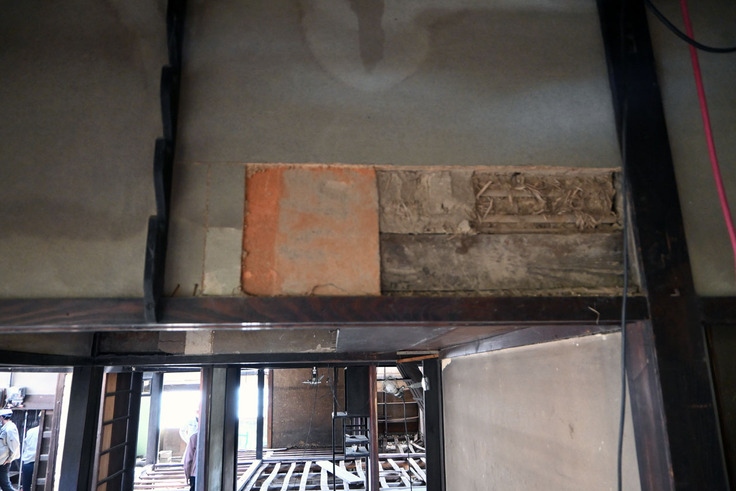 講堂の内壁を部分解体調査したところ,下層に赤土の上塗りが残っていることが確認されました。