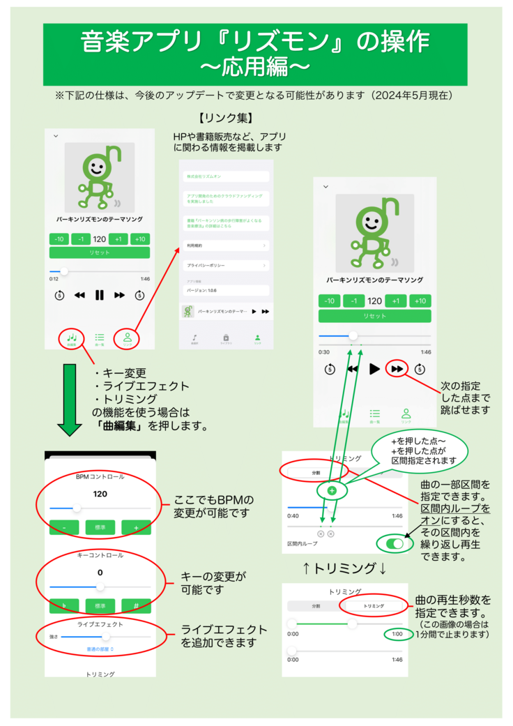 原曲より少しゆっくり / 速く歩いてみたり、楽器やダンスをゆっくりのテンポから練習したりできます。