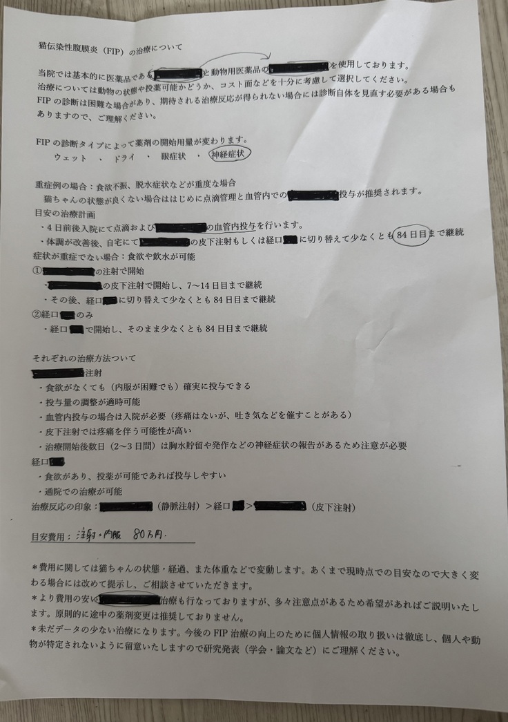 84日間、薬を継続投与し、FIPの寛解を目指します。