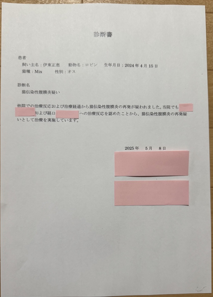 そこで、再度精密検査をしFIPの再発と診断されました。