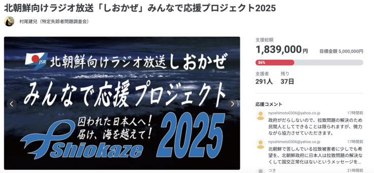 なお現在、特定失踪者問題調査会では、「しおかぜ」みんなで応援プロジェクト2025に挑戦中です!皆様に【北朝鮮向けラジオ「しおかぜ」放送送信費用】を支援していただきたく、お願い申し上げます。